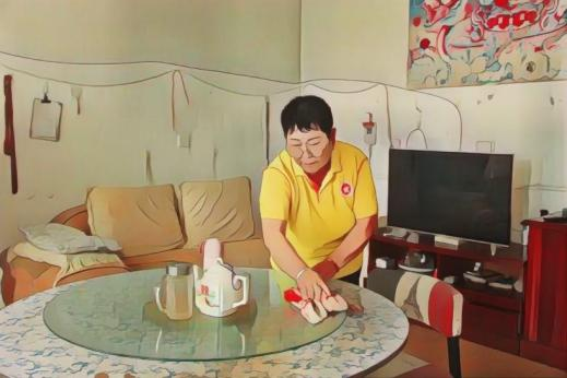 到家后,冯建华顾不上喝一口水,放下拎着的大包小件,便开始和面,为老两口准备午饭。“老冯血糖高,不能吃太甜;他妻子牙口不好,饭菜要煮得软烂些。”这些细节,冯建华都记在心里。夏天的时候,室外温度有三十多度,厨房更是闷热。冯建华说:“老冯智力障碍的妻子,看我忙得满头大汗,经常拿起一块抹布就给我擦汗,虽然擦得满脸是油,但是我心里特别高兴。”趁着冯广庭夫妇吃饭的工夫,冯建华已经麻利地给床铺和被子换好干净的床单、被罩,替换下来的床单、被罩、脏衣服已经在洗衣机里清洗了。“小冯每次来家里都不吃饭,就是干活,我特别过意不去”冯广庭说。直到下午四五点,冯建华洗完碗筷,晾上衣物,打扫完房间,再坐40分钟公交车回家。